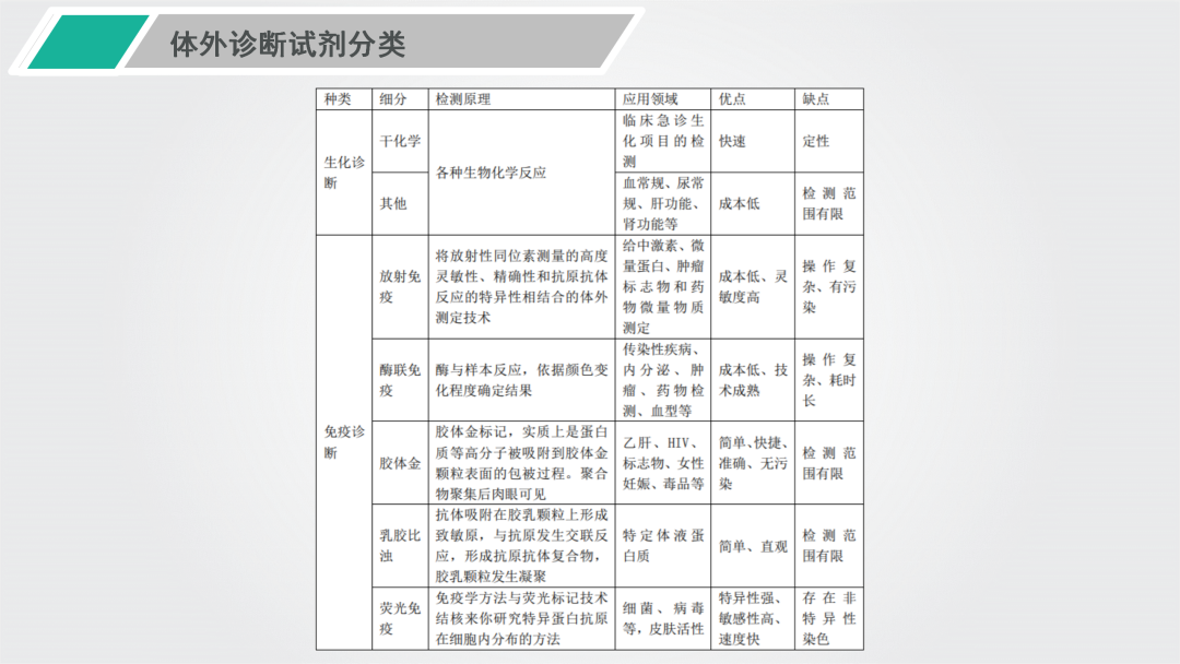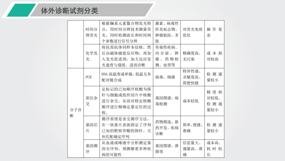 體外診斷按檢測原理或檢測方法分類,主要分為生化診斷、免疫診斷、分子診斷、微生物診斷、尿液診斷、凝血類診斷、血液和流式細胞診斷、POCT等診斷方法,其中生化、免疫、分子診斷是目前我國體外診斷的主要方法。