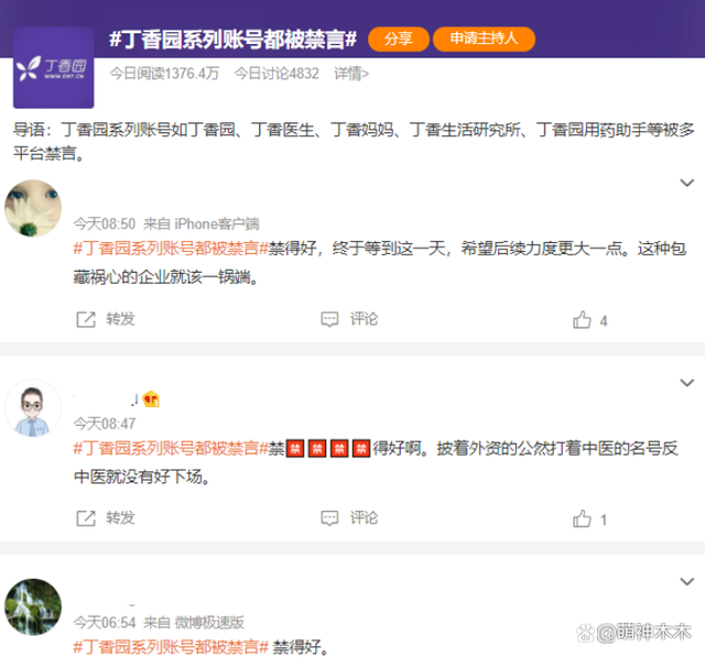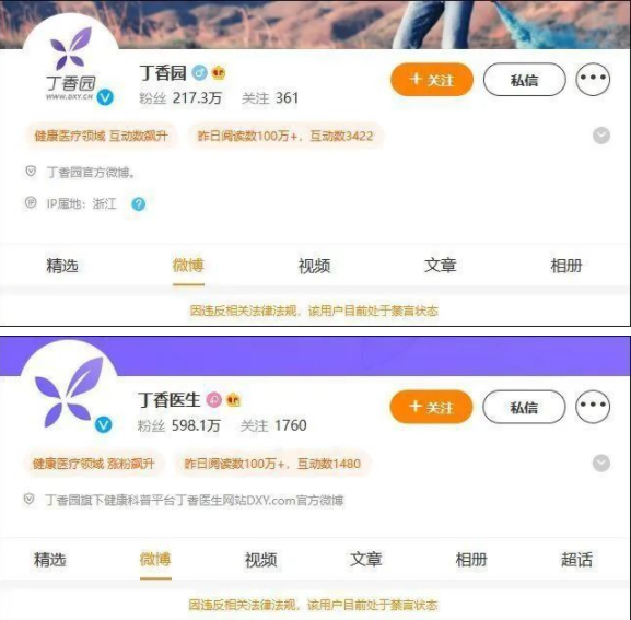 據了解,目前丁香園、丁香醫生、丁香媽媽、丁香生活研究所四個官方微博顯示,因違反相關法律法規,四個用戶處于禁言狀態。