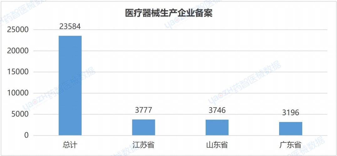 從事第一類醫療器械生產企業,向所在地設區的市級食品藥品監督管理部門備案。截至2023年,注冊醫療器械生產備案企業數量前三的省份依次是江蘇省、山東省、廣東省。