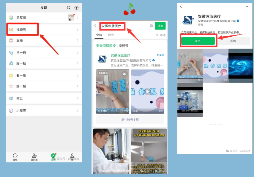2、打開微信,點擊“發現”中的視頻號,在微信視頻號搜索框,搜索“安徽深藍醫療”后,即可關注相應的視頻號。