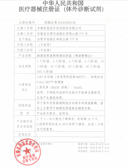 近日,深藍(lán)醫(yī)療研發(fā)的細(xì)菌性陰道病檢測(cè)試劑盒(唾液酸酶法)通過(guò)國(guó)家藥品監(jiān)督管理局審核,獲批上市。此前,該試劑盒的冷藏儲(chǔ)存版已經(jīng)獲得了注冊(cè)證,本次獲批的是更便于運(yùn)輸、銷(xiāo)售和使用的常溫儲(chǔ)存版。這也是深藍(lán)醫(yī)療繼單項(xiàng)/三聯(lián)/四聯(lián)細(xì)菌性陰道病檢測(cè)試劑盒(酶化學(xué)反應(yīng)法)、陰道炎快速檢測(cè)試劑盒(多胺法)后,又一獲批上市的婦科檢測(cè)整體解決方案代表性產(chǎn)品。