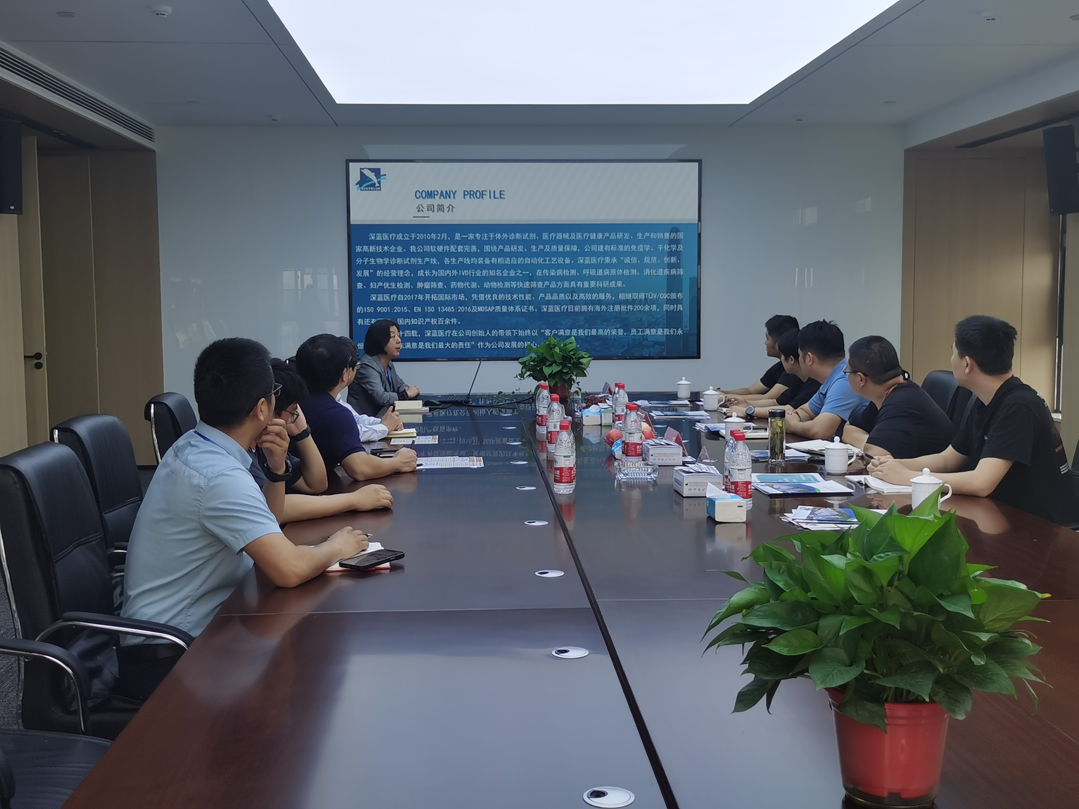 上午9時許,合肥市公安局刑事科學技術研究所靳處長一行抵達,受到了深藍醫療的熱烈歡迎。在會議室,雙方舉行了親切友好的座談會。深藍醫療董事長張超首先對研究所的來訪表示衷心感謝,并詳細介紹了企業的發展歷程、業務范圍及所取得的成就。同時,強調了企業一直致力于將先進的體外診斷技術應用于社會公共服務領域,為保障人民生命健康和社會安全提供支持。深藍醫療總經理陳奉玲介紹了近年來企業在體外診斷領域的重點項目和研發方向,特別是在一些與刑事科學技術相關的交叉領域,如藥物代謝檢測產品研發等方面所取得的進展。