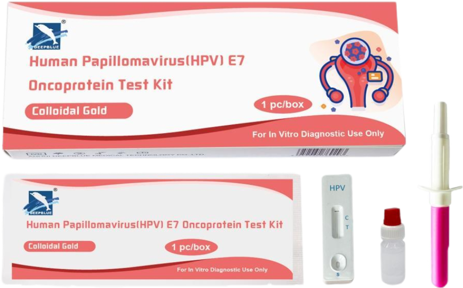 HPV感染后的細胞中利用人體細胞機制表達產生E7蛋白,它可以通過結合并降解視網膜母細胞瘤蛋白(pRb),使感染的細胞無限的增殖并惡性轉變。隨著宮頸癌的發展,E7蛋白持續活躍并不斷侵蝕正常細胞,E7蛋白的表達量呈現由少到多的變化;與此同時HPV DNA的表達量病變的發展而減弱。該檢測試劑盒用于定性檢測女性宮頸脫落細胞中的E7蛋白,用于女性宮頸疾病的輔助診斷,可以用于使用者自行居家檢測。