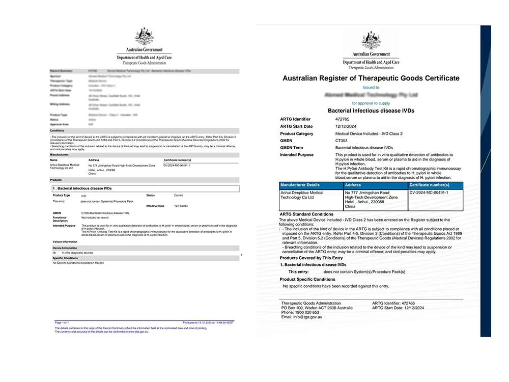 近日,深藍醫療傳來喜訊,公司自主研發的幽門螺旋桿菌抗體檢測試劑盒成功獲得澳大利亞醫療產品管理局(TGA)認證(編號:DV-2024-MC-06491-1),這一里程碑式的成就標志著深藍醫療實現了零的突破,開啟了進軍國際市場的新篇章,在市場拓展上邁出了重要的一步,也為全球幽門螺旋桿菌檢測領域注入了新的活力。