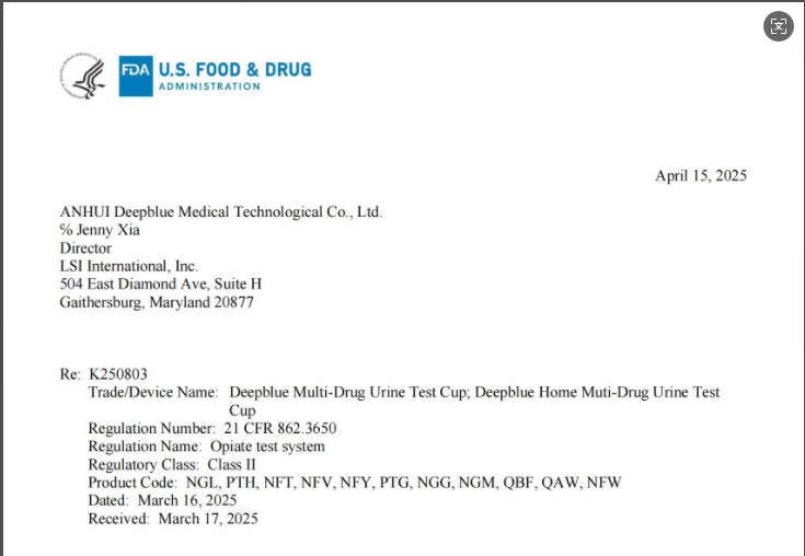 2025年4月16日,安徽深藍醫療科技股份有限公司(以下簡稱“深藍醫療”)迎來全球化戰略的重要里程碑——自主研發的多項毒品聯合檢測試劑盒正式通過美國食品藥品監督管理局(FDA)510K認證!這一認證標志著深藍醫療的技術實力、產品質量及合規性獲得國際權威認可,為開拓歐美及全球市場奠定堅實基礎。