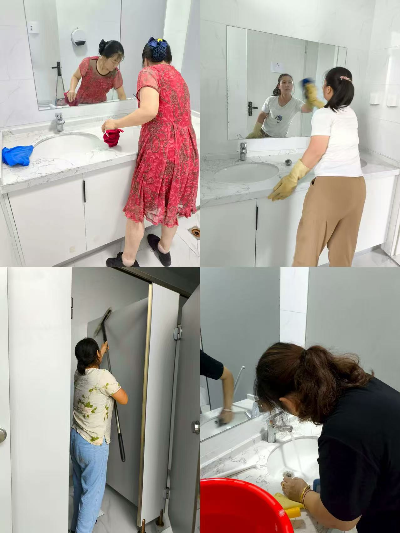 比賽主賽場(chǎng)設(shè)于2號(hào)樓三樓和四樓的四個(gè)衛(wèi)生間,衛(wèi)生間區(qū)域日常使用頻繁、清潔要求高,是檢驗(yàn)保潔人員實(shí)戰(zhàn)能力的理想場(chǎng)所。賽事不僅注重基礎(chǔ)清潔,更強(qiáng)調(diào)細(xì)節(jié)處理和規(guī)范操作,全面涵蓋地面、墻面、洗手臺(tái)、鏡面、蹲坑、垃圾桶、門體、手機(jī)架及門把手等多個(gè)清潔項(xiàng)目,全方位考核選手的綜合技能與專注程度。